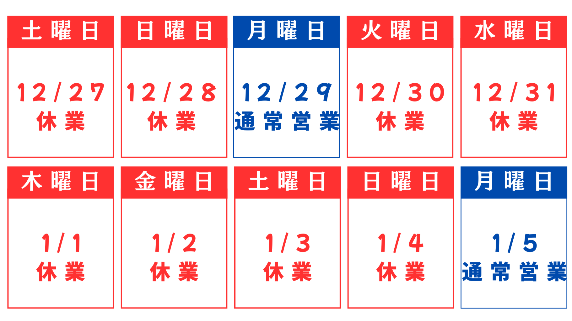投稿者:w-sakai 投稿公開日:2025年12月4日 投稿カテゴリー:お知らせ 年末年始休業のお知らせ 平素は格別のお引き立てを賜り厚く御礼申し上げます。2025年12月27日(土)~2026年1月5日(月)の営業については下記の通りとなりますので、ご案内申し上げます。配送は特別配送日がありますので、各工場に問い合わせお願いします。(尾竹橋工場 TEL:03-3892-3561 墨田工場 TEL:03-3613-4321 ) ※休業中に頂いたお問い合わせにつきましては、休業明けにご連絡いたします。 株式会社 小野田商店 Please Share This Share this content Opens in a new window Opens in a new window Opens in a new window その他の記事を読む 前の投稿【広報必見?!】知っておきたい生成AIや画像編集サービスなどの著作権(後編) 次の投稿冬になっても氷屋は止まれない!今冬注目の東京「氷」ニュース! おすすめ 年末年始休業のおしらせ(2023-2024) 2023年12月26日 2022年版クリスマス氷華発売のお知らせ(※販売終了しました) 2022年11月15日 今年もふるさと渋谷フェスティバルに協力します! 2023年10月31日