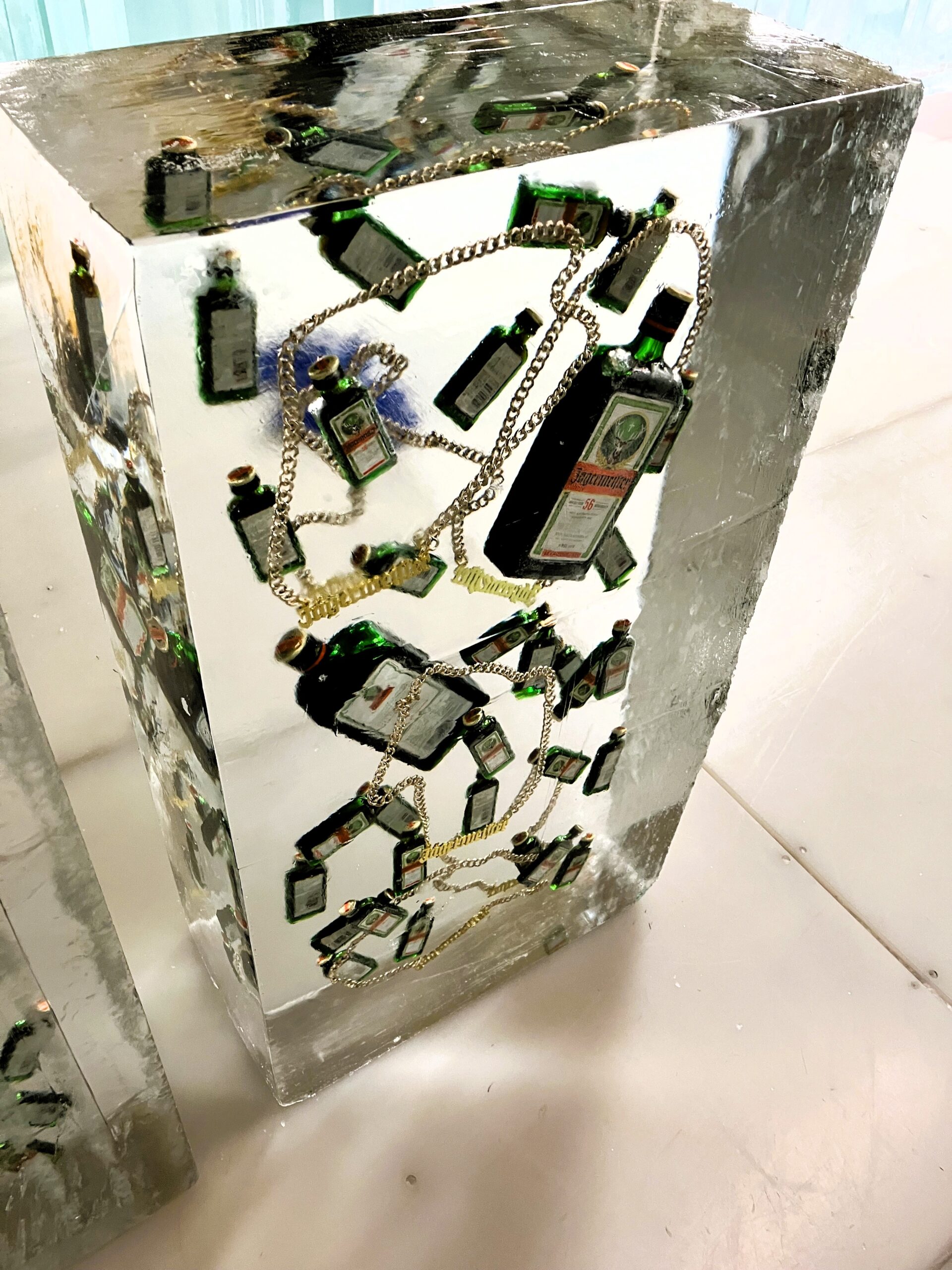 ツリー型のハーバリウム用ボトル(ボトルの中はプリザーブドフラワー、オイルなしのツリーアレンジ作品)を氷に閉じ込めた。